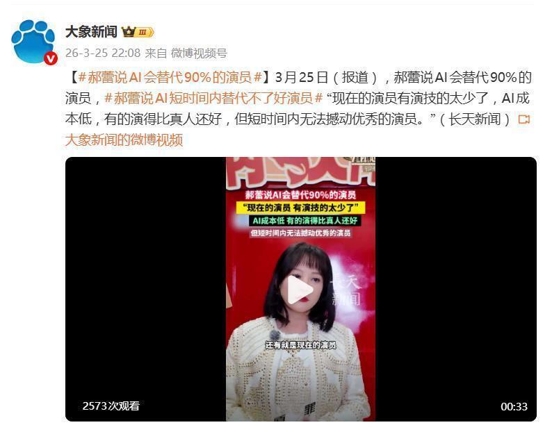 据 3 月 25 日晚间报道,演员郝蕾在一档综艺节目中的一番直言,如同向娱乐圈投下了一颗 " 深水炸弹 "。她断言 "AI 将会替代 90% 的演员 ",理由直白又扎心:" 现在的演员有演技的太少了,AI 成本低,有的演得比真人还好。" 此言一出,迅速引爆网络,一场关于演技、技术与行业未来的激烈讨论就此展开。
